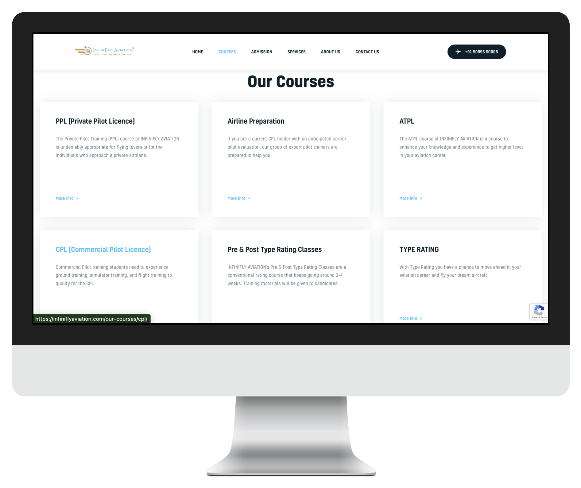 InfiniFly Aviation aimed for a website that mirrors their premium brand reputation and conveys the comprehensive nature of their pilot training programs. They needed a polished platform to present detailed course information—from PPL and CPL to ATPL and type rating—and to reinforce their DGCA accreditation and global training options. Additionally, they required strong testimonial content and trust indicators to assure prospective students of their training quality